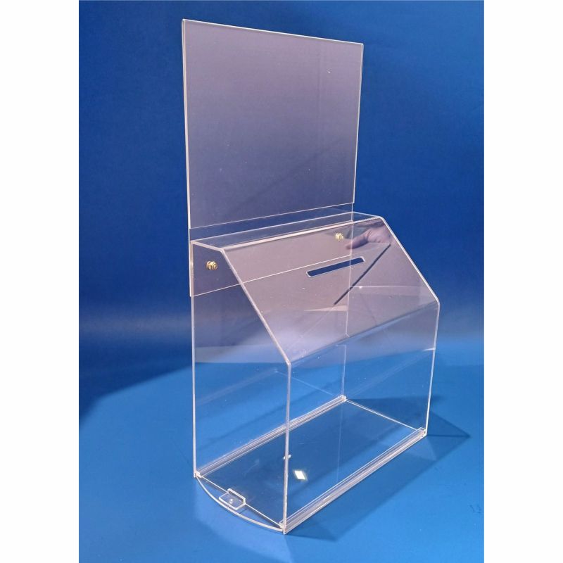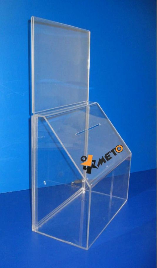 Прозрачната плексигласова кутия с размери 300 х 150 х 300 мм и джоб за постер формат А4 е перфектно решение за вашите дарителски кампании, томболи, анкети и събиране на талони.