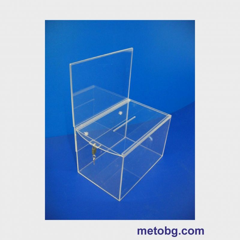 Плексигласова кутия за дарения и томболи с отделящ се джоб за постер А4.