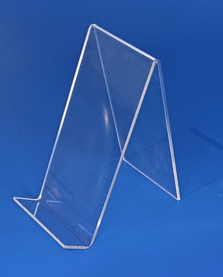 Изработена от 2 мм прозрачен плексиглас, стойката е с размери: ширина 70 мм, височина 120 мм, дължина на крачето 100 мм и борд 20 мм.