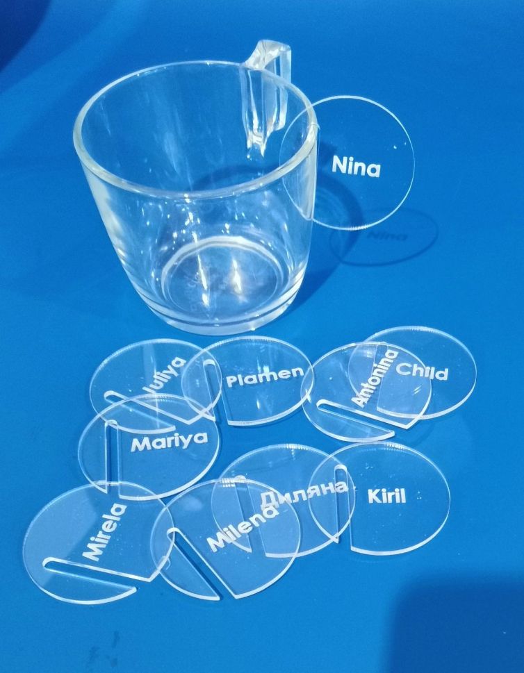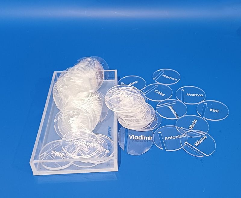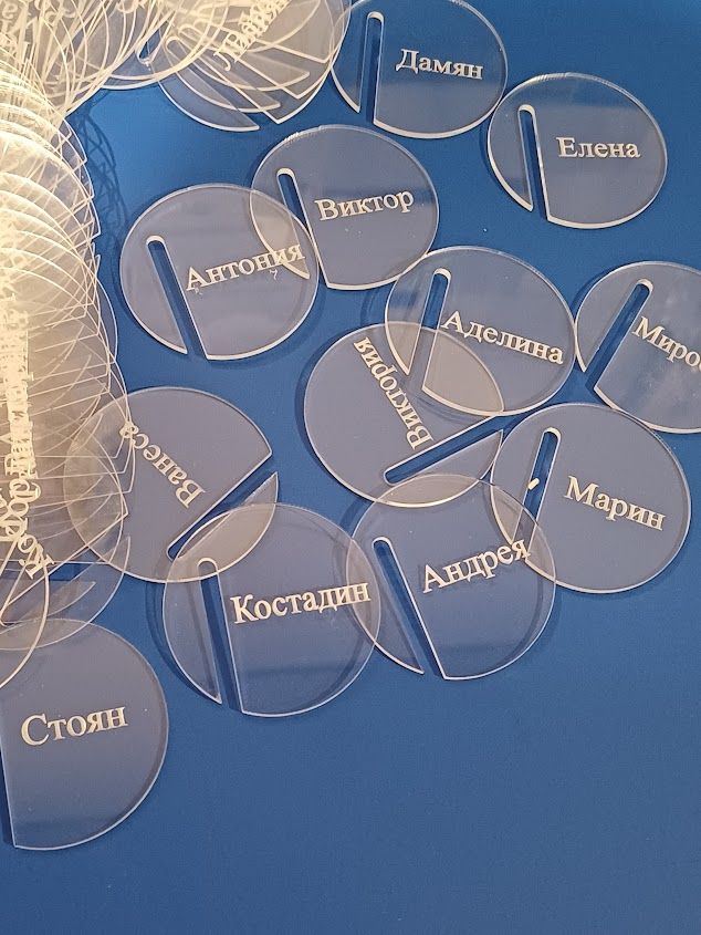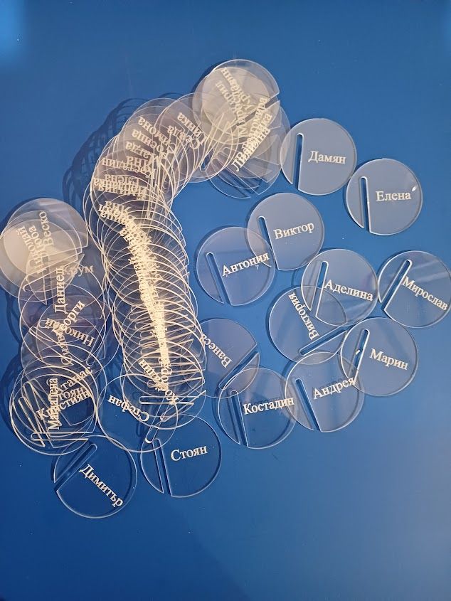 Персонализирани табелки с гравирани имена, изработени от прозрачен плексиглас с диаметър 50 мм.