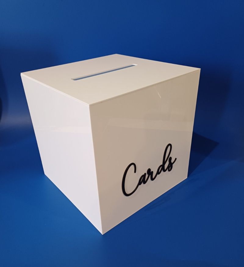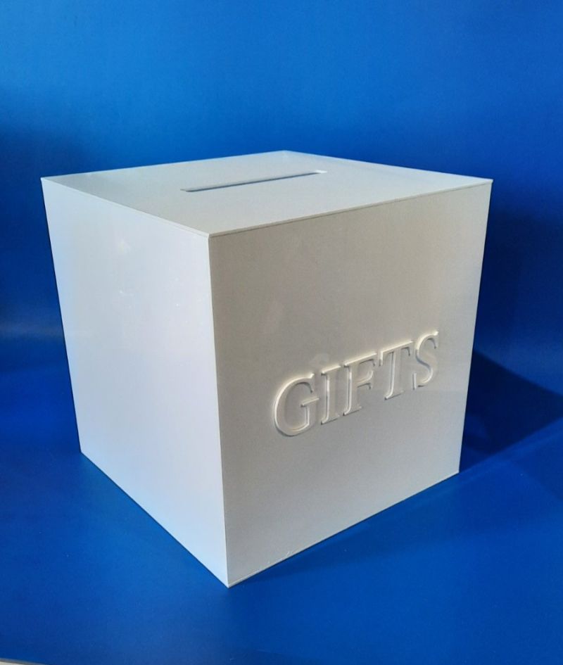 Елегантна бяла сватбена кутия за пликове и подаръци, изработена от плътен или сатенено прозрачен плексиглас.