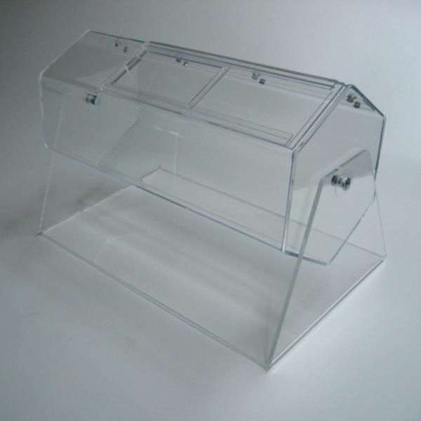 Въртяща шестстенна плексигласова кутия на стабилна стойка, изработена от прозрачен плексиглас.